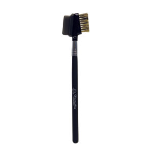 Features a steel bristle eyelash separator with a plastic cover on one side and a black nylon eyebrow brush on the other side.
